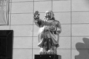 2月17日,辽宁省沈阳市,沈阳一座商城门外的“风衣弥勒佛”。