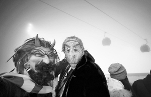 当地时间2月16日,索契冬奥会冬季两项男子15公里集体出发比赛因一场突如其来的大雾而延迟举行。图为观众在等待比赛开始。