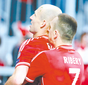 拜仁队球员罗本(左)在比赛中与队友里贝里庆祝入球