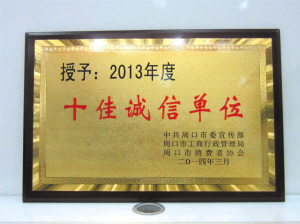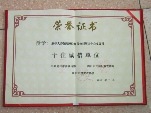 近日,新华保险周口中心支公司被周口市委宣传部、周口市工商行政管理局、周口市消费者协会评为2013年度“十佳诚信单位”荣誉称号,并颁发了牌匾和荣誉证书。