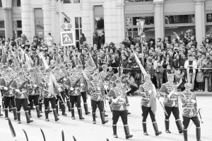 5月6日,在保加利亚首都索非亚市中心,市民观看阅兵游行。