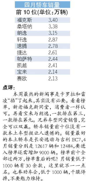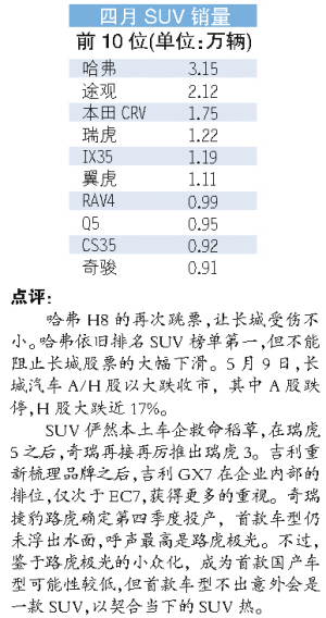 4月,本土品牌销售59.69万辆,占乘用车销售总量的37.1%,比上月下降2.2个百分点,比上年同期下降2.5个百分点。在轿车领域,本土品牌始终找不出好的“止跌”办法。4月份,本土轿车仅销售22.66万辆,市场占有率比上月下降1.7个百分点,比上年同期下降4.7个百分点。如不是在SUV上拿到足够多的销量,本土品牌业绩会更加难看。
