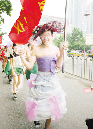 5月19日,在周口市区七一中路,一群年轻人穿着奇装异服在“游街”,一个小伙子穿着“性感独特”的晚礼服,带领队伍前进。看样子又是某个商家的另类生意经了。
