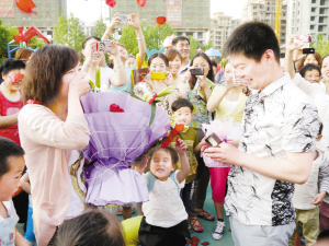 昨天是5月20日,谐音“我爱你”。近年来,5月20日当天被青年们当做表白日。当天傍晚,市民郭先生手捧一束红玫瑰花,来到周口市文昌幼儿园,向在这里工作的女友刘女士求婚。晚报记者 宋风 摄
