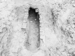墓葬发现处位于周口市东新区,南邻沙颍河北大堤,西邻周口大道,市体育场西南角。墓葬为南北向砖室墓,开口距地表约4.5米,墓葬平面呈梯形,南北内长约2.2米,南宽约0.65米,北宽约0.45米,深约1.15米,内葬1人,头向南,仰身直肢,葬具为棺。