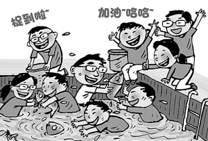 中考在即,何以解忧?东莞长安实验中学近千名初三师生在校内游泳池开展抓鱼比赛,学校后勤人员还将捉到的鱼全部煲汤、煲粥,给学生们做夜宵。校方试图通过这样“乐翻天”的活动,给初三学子们减压。