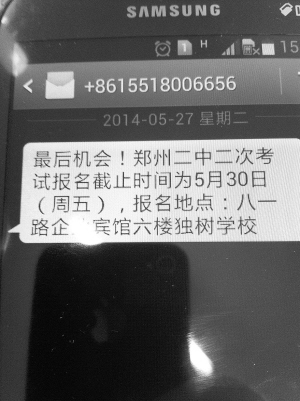 一些学生家长介绍,从4月27日至5月30日,郑州市多所学校先后与周口方面联系,暗地里进行优等生选拔考试,并向学生家长发送大量有关报名考试的短信(如图)。家长很不解——郑州的学校是怎样知道学生家长的手机号的?