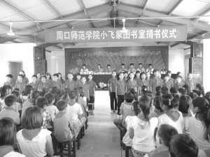周口师范学院的“小飞象”团队是一个学生团体,他们把平时积攒下来的零用钱,购买少儿读物,捐赠给农村学校,建立“小飞象”图书室。此前,“小飞象”团队已经成功捐助了5所农村学校,并帮助他们建立了“小飞象”图书室。