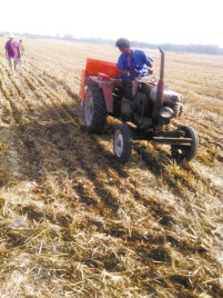 6月6日下午,经过阳光的照射与微风的吹拂,收割过的麦田的地表已经泛白,一些农民开始用播种机耩大豆。