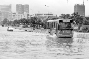 6月11日,公共汽车通过广西北海市贵州路一积水路段。
