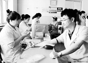 6月12日,黑龙江省黑河市第二人民医院职工在义务献血。