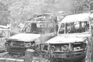 6月16日,在肯尼亚沿海拉穆地区姆佩卡托尼镇,政府车辆在袭击中被烧毁。