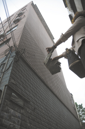 在家属院门口值班的张老太说,水泥块是6月15日下午开始脱落的,当时险些砸到一名路过的小女孩。“这也没个警示标志,行人走在下面很容易被砸伤。”记者拿起一块脱落的水泥板,发现很重。“楼顶至地面的距离至少20米,一旦砸到行人后果不堪设想。”一位居民说。