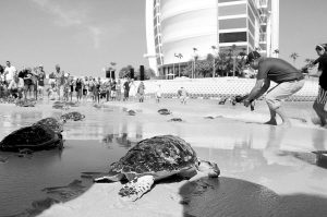 据主办方介绍,当日有110只伤愈康复的海龟被放生,活动为庆祝一家海龟康复中心启动10周年而举行。该海龟康复中心由当地两家酒店创立于2004年,专门救治阿联酋沿海受伤或生病的濒危玳瑁海龟,迄今已帮助692只海龟重归大海。