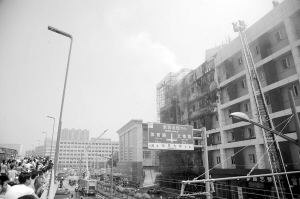 6月22日,太原长风街附近一快捷酒店失火,消防人员在现场扑救。