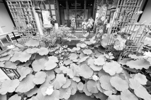 西湖郭庄景区内展出的一组“蝶恋花”荷花主题园艺造型(6月24日摄)。