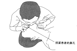 第三步:捏住病人鼻子,向其口中吹气2次。其间,旁人可搭病人脉搏,并把耳朵贴向病人鼻子检查心跳、呼吸是否恢复。(南方)