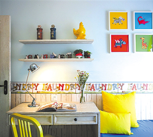 素雅的空间,用些纯色小色块来点缀,儿童装饰画和彩色玩偶给墙面平添趣味,纯色的黄绿色坐椅,明黄的靠垫搭配海蓝的床品,给空间营造了温暖明朗的氛围。