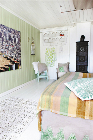 薄荷绿的墙面让卧室看起来凉快不少,淡绿的梯形凳,墙上的绿花衬衣,和绿色刺绣的床品相互呼应,在白色背景的衬托下更显清爽,赶走夏天卧室的闷热气息。