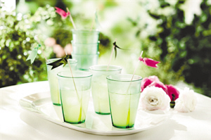 烈日当头一杯冰爽的自制饮料解渴又消暑,选一套透明的薄荷绿色玻璃杯,将饮料加点冰块、薄荷叶,再搭配一个大号白色瓷托盘,朋友小聚或家人乘凉时端上来,解暑降温又凉气儿十足。