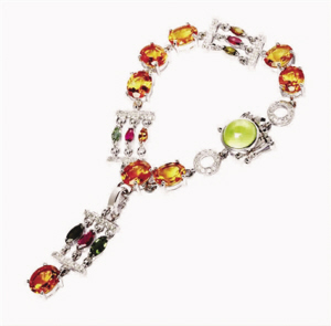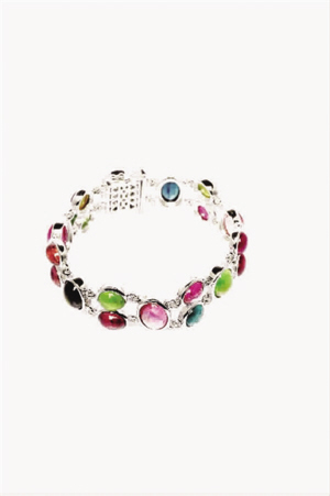 既然五彩斑斓本就是碧玺的本色,不妨将各种颜色凑齐,来一个调色盘般的快乐印记。这只流光溢彩的碧玺手环,由大大小小、不同颜色的圆形碧玺宝石相连而成,虽不及项链那么华丽奢侈,却也十分地美丽多彩,价格也更亲民些,适合送给年轻女生。