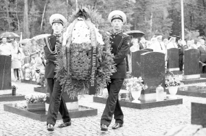 8月12日,士兵在俄罗斯圣彼得堡谢拉菲莫夫墓地参加献花活动,纪念“库尔斯克”号核潜艇失事14周年。