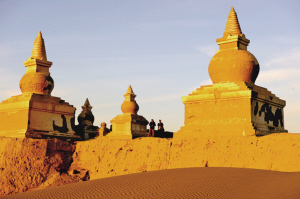 而在海子边有座建于1755年的藏传佛教寺庙,白墙金顶汉藏混合的建筑背靠沙山,面朝湖水,庄严肃穆,幽静典雅,被称为“沙漠故宫”,是巴丹吉林沙漠的地标,亦是牧民心目中神圣的殿堂。到10月,更是沙漠中的额济纳旗胡杨林魅力尽展的最美季节,一夜寒露会骤然把整片的胡杨树全部染黄。古老而沧桑的胡杨林衬托着落日的壮阔景象,沙漠绿洲晚归牧群、秋天里罕见的大漠风光,具有非凡的吸引力。