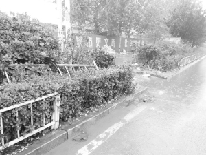 受损的不只是窨井盖,还有路边绿化带的护栏。庆丰路两侧,一些靠近胡同口、商店的绿化带被人破坏,变成人行通道,被破坏的护栏没有被人修复,一些护栏甚至被人扔在绿化带中。而未被拆掉的护栏也多是锈迹斑斑。另外,还有一些被撞歪的护栏没有被及时修复。