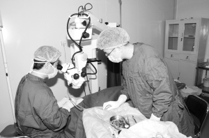 近日,周口市中医院艾格眼科来了一名“年轻”的白内障患者——项城市52岁的王某。说他“年轻”,是因为这个年龄在白内障患者中确属年轻。他的白内障属于糖尿病并发症,0.2的视力使他的工作、生活受到很大影响。他慕名来到市中医院进行白内障手术,术后第一天视力达到0.8,第三天出院时视力已经恢复到1.0。王先生高兴地说,没想到困绕他几年的白内障在这里3天就彻底解决了。图为周口市中医院艾格眼科医生在为王先生做白内障手术。通讯员 黎倩平 摄