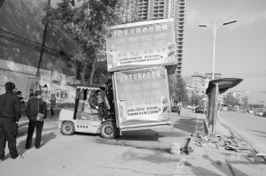 12月1日上午,川汇区七一路办事处城管中队的城管队员在川汇区城管局的配合下,出动机械车辆,强制拆除大庆路与七一路交叉口向南50米路西的一处常年占道的广告亭。据了解,该广告亭于近期披上了公益宣传的“外衣”,但由于其一直没有合法手续,办事处多次下达整改通知书无果,便依法予以拆除。