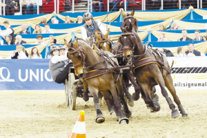 11月30日,2014-2015赛季国际马术联合会马车世界杯匈牙利站,获得冠军的荷兰车手徳龙徳和他的车队在比赛中。
