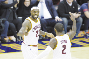 当地时间12月2日,骑士队球员詹姆斯(左)在比赛中与队友欧文相互鼓励。当日,在2014-2015赛季NBA常规赛中,克利夫兰骑士队主场以111∶108战胜密尔沃基雄鹿队。新华社发