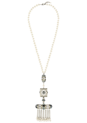 2015早春系列,Chanel延续了以往的经典与优雅,并应景地将充满中东风情的阿拉伯长袍、新月图案头饰以及繁复的珠宝配饰等完美地融入其中,据说该系列的珠宝配饰设计赢得了不少人的赞赏。从Chanel 2015春夏系列中,我们还可以看到修身长裤在该系列中的重要性,几乎每一套搭配中都少不了修身长裤的存在。