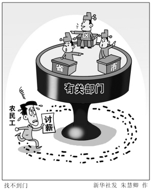 “劳动监察支队、信访局、市政府、明山区政府、区公安分局、区信访局、区劳动监察支队、辽宁省信访局……说起来,部门各个都有权,可为啥现在还是原地‘打磨磨’?”来自湖北孝感的农民工毛道文说,打了这么多年工,头一次遭遇这么艰难的讨薪。