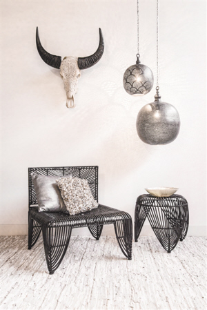 在圣诞节来临之时,可以利用白色和银色圣诞装饰,创造一个童话世界。白色为底,加入黑色家具和银色吊灯,是不是立刻就有了民族风和异国情调?牛头装饰起到了画龙点睛的效果,而椅子上的靠包则让温暖感包裹着你。