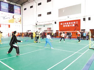 本报讯 12月18日上午,首届周口市直单位职工羽毛球赛如期在市体育中心综合训练馆(“健之语”运动俱乐部)开赛(如图)。38支参赛队伍、近300名参赛队员的规模创了周口羽毛球比赛史上的新纪录。