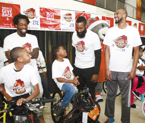 当地时间12月23日,火箭队球员布鲁尔、哈登、贝弗利(后排自右至左)在活动中同学生们交谈。当日,休斯敦火箭队成员向休斯敦100名学生赠送自行车,与他们同庆即将到来的圣诞节。