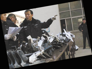 记者在现场看到,248支仿真枪、1567把管制刀具、4把弓弩及700多只报废公务用枪摆满两张桌子(如图)。周口市公安局特殊勤务支队的巡特警和当地派出所民警保护现场安全。河南省公安厅治安总队工作人员核查现场枪支后,非法枪爆物品和报废公务用枪被放进熔炉。