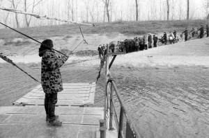 当又一拨乡亲赶来过河时,记者随他们登上了渡船。原来这个铁皮船是可以用机器带的,只是船主为了省油,机器没开,靠人力拉固定好的缆绳前行,乘客的单程船费是一元。记者随乡亲们一同拽住缆绳,体验了一次原始的摆渡,虽然河面寒风扑面,但波光粼粼的沙河水还是有一份诗情画意的。