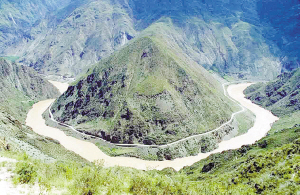“长江第一湾”位于云南省西北部的丽江市石鼓镇与香格里拉县南部沙松碧村之间。万里长江从青藏高原奔腾而下,到了香格里拉县的沙松碧村,突然来了个100多度的急转弯,转向东北,形成了罕见的"V"字形大湾,“江流到此成逆转,奔入中原壮大观”,人们称这天下奇观为“长江第一湾”。