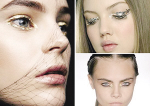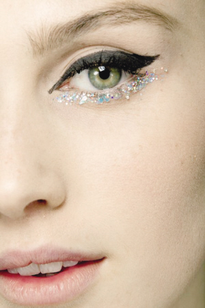 以金属亮片装点在眼睛周围。这个方法相对费工却也是最特别的眼妆look,亮片随着眼睛眨呀眨的更显闪亮感与光芒。
