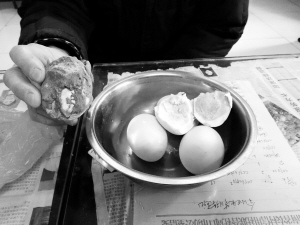 据张先生介绍,假鸭蛋是他1月19日早上在市区七一路与汉阳路交叉口北侧路西的小农贸市场购买的,卖鸭蛋的是一位中年妇女,她骑着一辆电动三轮车,车上装满了用黄胶泥腌制的鸭蛋,车上的小喇叭喊着“咸鸭蛋10元9个”。由于价格便宜,鸭蛋个头儿大,张先生一下子买了50元钱的。