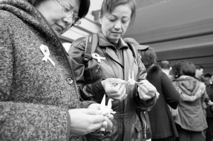 2月10日,在台北市第二殡仪馆景仰厅,市民折千纸鹤祭奠罹难者。
