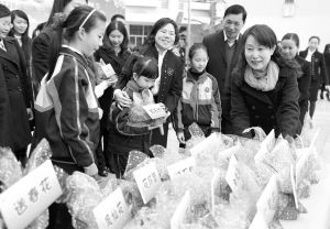 3月2日,广西南宁市滨湖路小学校长(前右一)向学生们赠送花种。