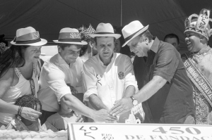 3月1日,在巴西里约热内卢,里约热内卢市长爱德华多·帕埃斯(中)与里约热内卢州州长路易斯·费尔南多·佩桑(右二)在庆祝活动上点燃蛋糕上的蜡烛。