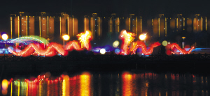 3月5日是元宵节,夜幕下的中心城区绚丽多彩、景色旖旎,人们纷纷走上街头,人潮车流汇聚在一起,赏灯观景一片热闹。晚报记者 朱海龙 摄