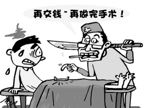 当你几乎赤身裸体地躺在手术台上,无影手术灯将你纤毫毕现地暴露于灯光下时,我想灯下的你除了无助,还有的就是惶恐与不安。再没想到的是,你倚为肱股的医生,竟然一边拿着刀,一边指着你流着血的要害之处,跟你说要另交费用,你有勇气拒绝他吗?就算问你银行密码,我相信,在如此条件下,你也会毫不犹豫地告诉他。但我只想含着眼泪问医生,难道术前你没有做好各方面的检查,非要在如此情况下说这事吗?