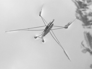 表面张力可以让液面自动收缩。在这种表面张力的作用下,对于可以用腿疏水划行的昆虫来说,水面就像蹦床一样。如果用接触水面的腿划水前行,表面张力不仅会把身体支撑在水面上的,而且会根据昆虫的大小,助其跳跃。同时,如果昆虫的身体沉在水里,那表面张力就帮助其将身体按压在水面。