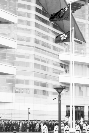 7时59分,升旗仪式正式开始,全体肃立。激昂的《义勇军进行曲》奏响,全场观众和嘉宾高唱国歌,注视着中华人民共和国国旗与香港特别行政区区旗冉冉升起。
