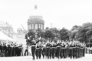 6月30日,中国人民解放军军乐团在俄罗斯圣彼得堡冬宫前的宫廷广场上表演。